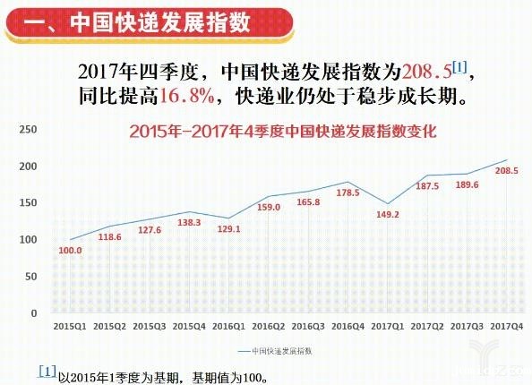 2017年四季度,中国快递发展指数为208.5,同比提高16.8%,快递业仍处于稳步成长期,呈现出发展态势高位运行,市场结构持续优化,资源要素加速集聚,网络稳步向下延伸,服务能力显著增强的特点,较好地应对了旺季快递服务需求,快递准公共服务属性凸显。据国家邮政局发展研究中心市场监管研究处负责人耿艳介绍,2018年中国快递发展指数将调整优化指标体系,加大发布频次,月度快递发展指数将于2月初首次与公众见面。